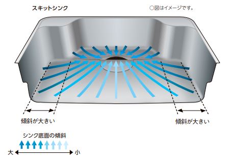 スキットシンクは排水口の手前の段差に向かい水が集まる形状で、段差でとらえた水はそのまま排水口へと流れます。