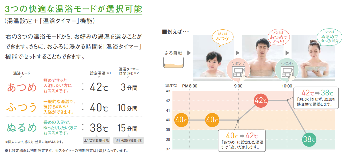 ゆっくりぬるめのお湯に入りたいなど、その日の気分に合わせてお湯の温度を3つのモードから選べます。