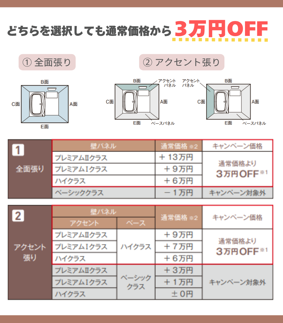 今回のキャンペーンでは、壁柄グレードアップでかかる費用から3万円OFF(メーカー希望小売価格)させていただきます。通常は、グレードアップに+6万円~+13万円かかりますので、このキャンペーンを利用すると+3万円~+10万円まで抑えることができますよ!