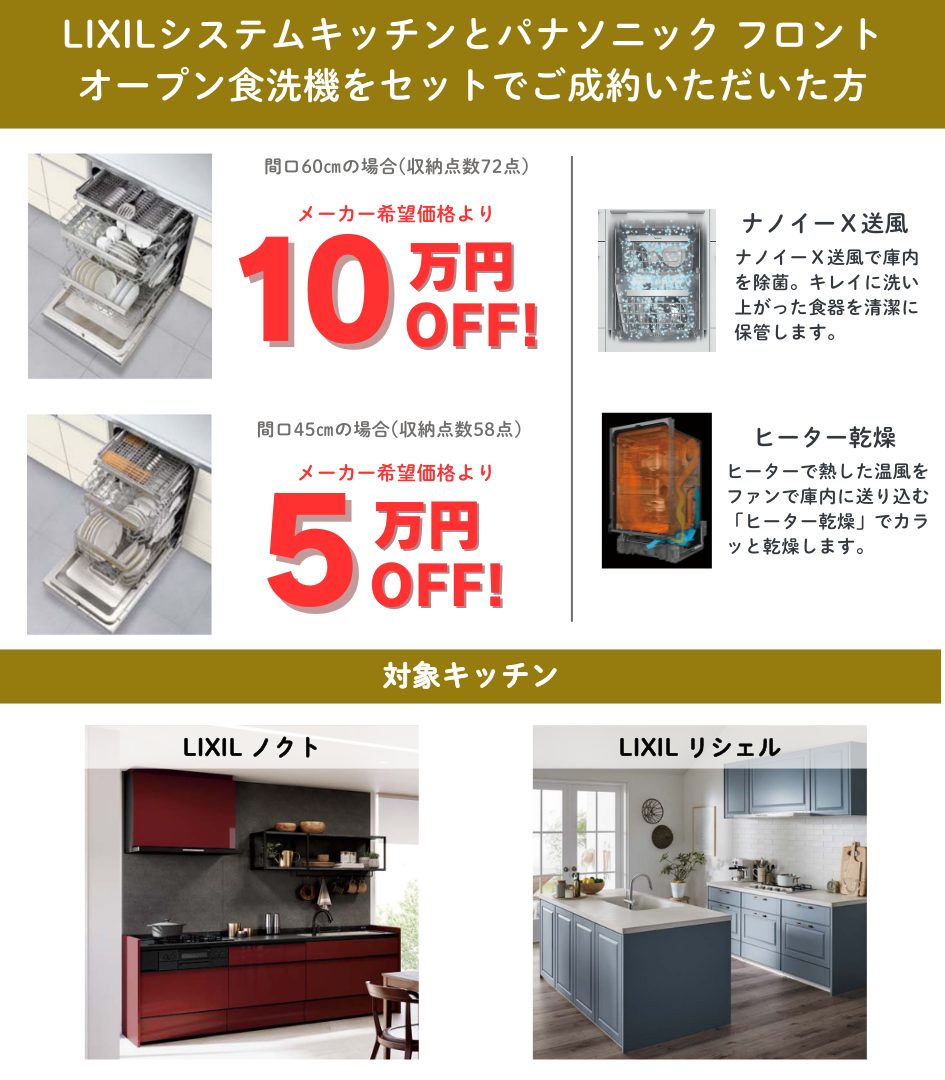 今回のキャンペーンでは、間口が60㎝のフロントオープン食洗機を設置すると10万円引き、間口が45㎝のもので5万円引きです。