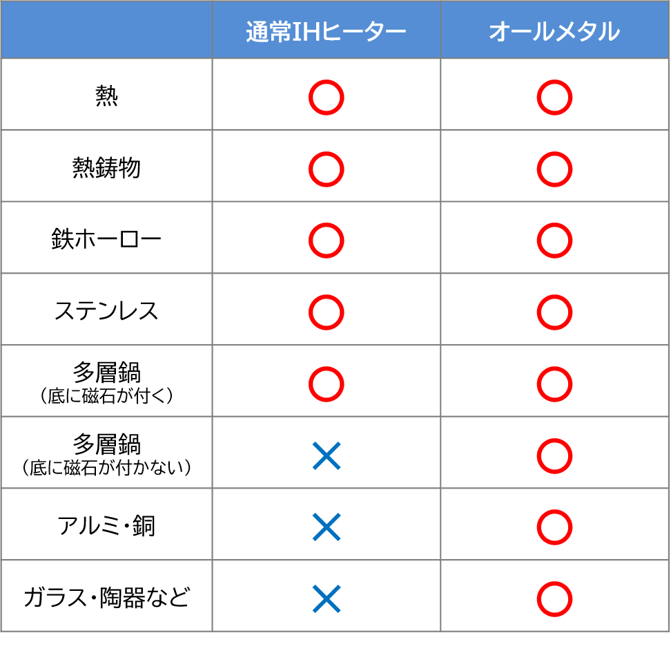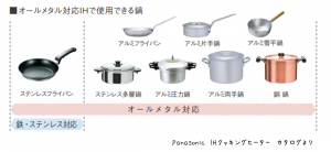 オールメタル対応IHとはその名の通り、すべての金属製調理器具が使用できるIHです。