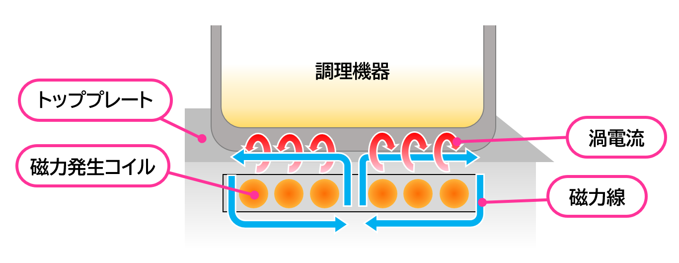 磁力発生コイルに電気が流れることによって、磁力線が発生します。その磁力が金属の調理機器を通る際に、渦電流に変わり、金属の電気抵抗によって熱が発生するという仕組みになっています。