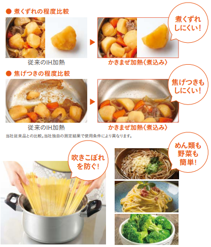内・外の加熱を切り替えて、鍋のなかに対流を起こし自然な「かきまぜ加熱」を行います。