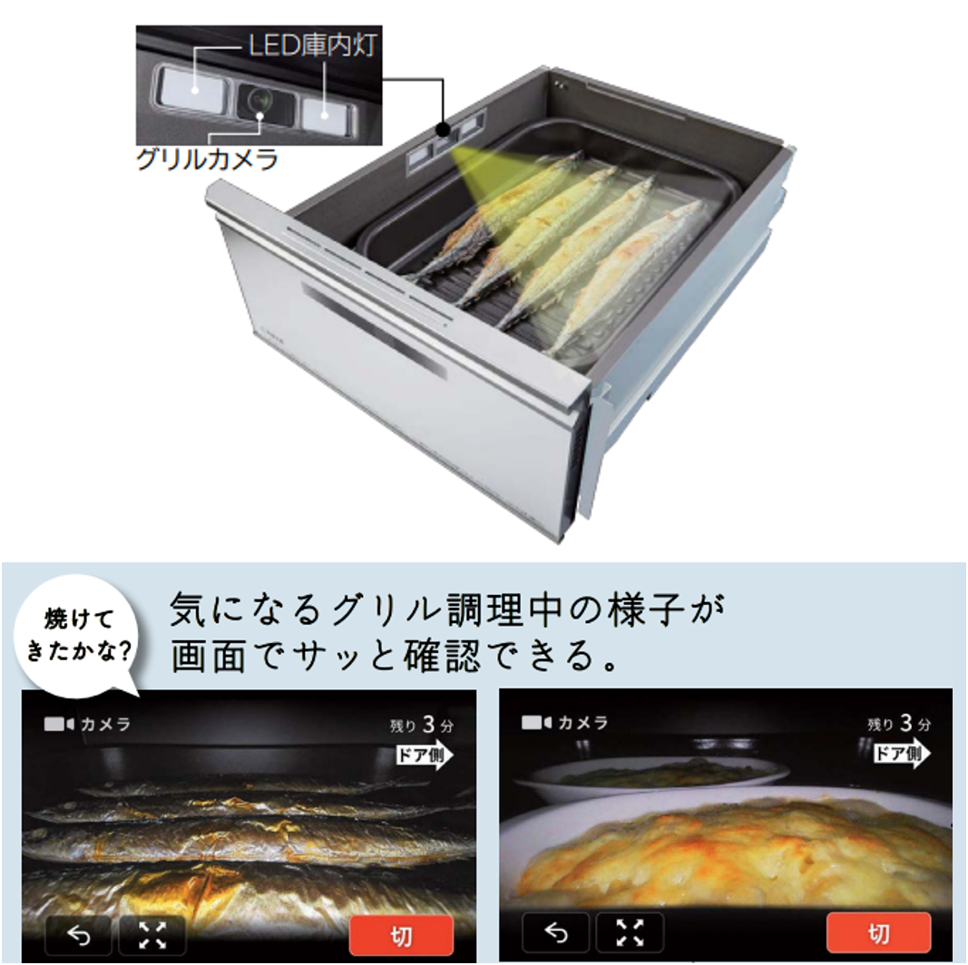 グリル内に設置されたカメラが、内部を撮影し、調中の状態をグリルを開けなくても確認できます。カメラで撮影した映像は、トッププレート上の小さな液晶に表示されます。