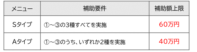 補助金上限は必須工事である①開口部の断熱改修、②外壁、屋根・天井または床の断熱改修、③エコ住宅設備の設置からいくつ工事を行ったかによって変わります。すべて行った場合はSタイプで60万円、2種行った場合はAタイプで40万円となります。