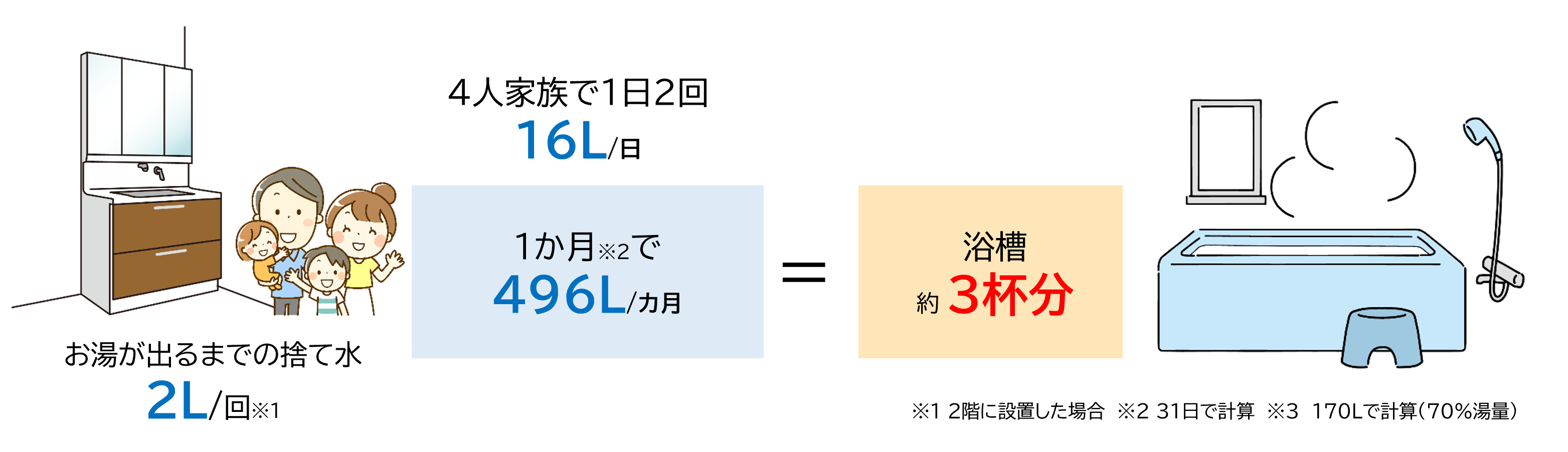 例えば、4人家族で1日二回洗面台を利用するとして、毎回お湯が出るまで水を出しっぱなしにしていると、ひと月で496L = 浴槽の水約3杯分の水が無駄になっている計算になるんです!