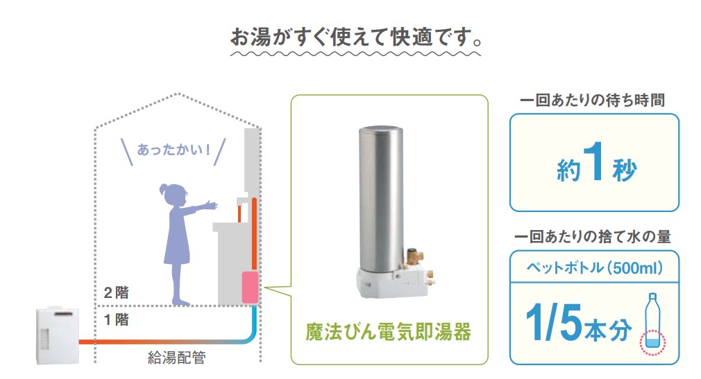 お湯が出るまでの間、水を出しっぱなしにすると一回あたり2Lの水を無駄にしている言われています。※2階設置の場合