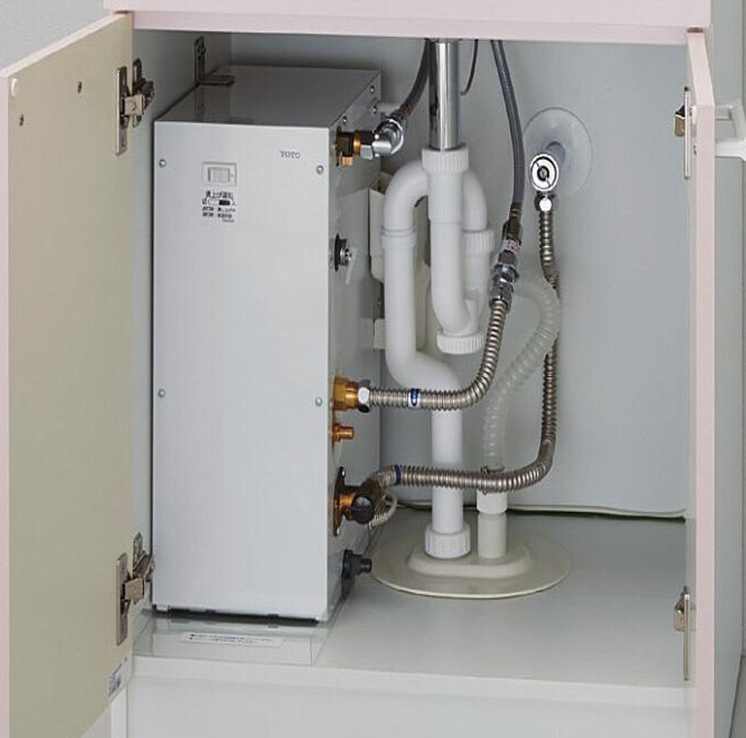 即湯器は洗面台の場合、洗面台下台内に設置します。収納の一部を占領するため、広く収納を使用したい方は注意が必要です。