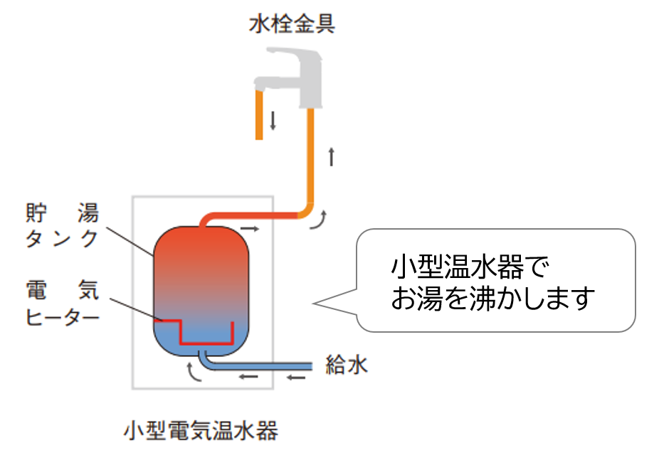 小型電気温水器は、その名の通り小さな電気温水器です。設置した設備のためだけにお湯を沸かすので、今までお湯配管がつながっていなかった箇所でもお湯をお使いいただけます。