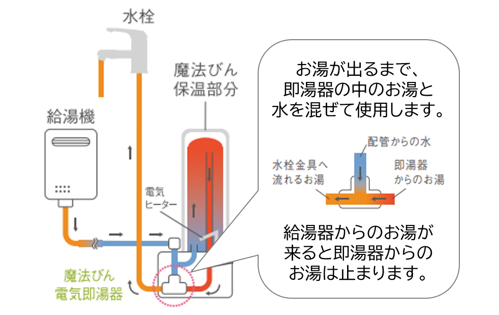 電気即湯器は、給湯器からのお湯が来るまでの間もお湯を使えるように、小型のタンクにお湯を貯めておける機器です。