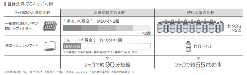 レンジフードの自動洗浄は10分程度、水も0.65L程度しか使用しないため、時間も水も節約できます。