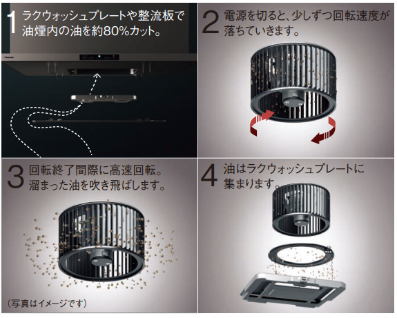 ファンまで届いた油は、レンジフード使用後に自動的にファンが高速回転することで落とします。落ちた油は、ラクウォッシュプレートに流れ落ちます。この構造で、ファンのお手入れ10年間不要を実現しました!※期間は目安です
