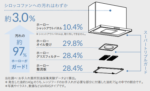 日常的にお手入れが必要なパーツは整流板、グリスフィルター、フードパネルの3カ所です。全てホーローで作られており、油汚れが簡単に落とせますよ!