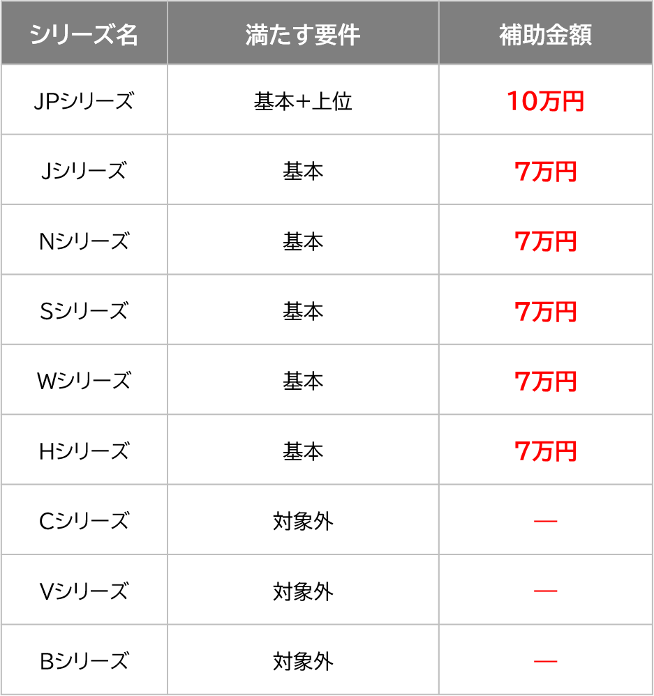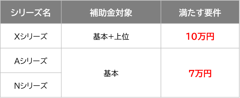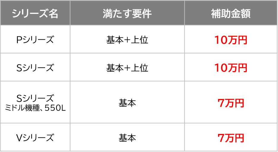 シリーズや商品によって満たす要件が異なりますので、詳細な補助金額についてはご相談ください。