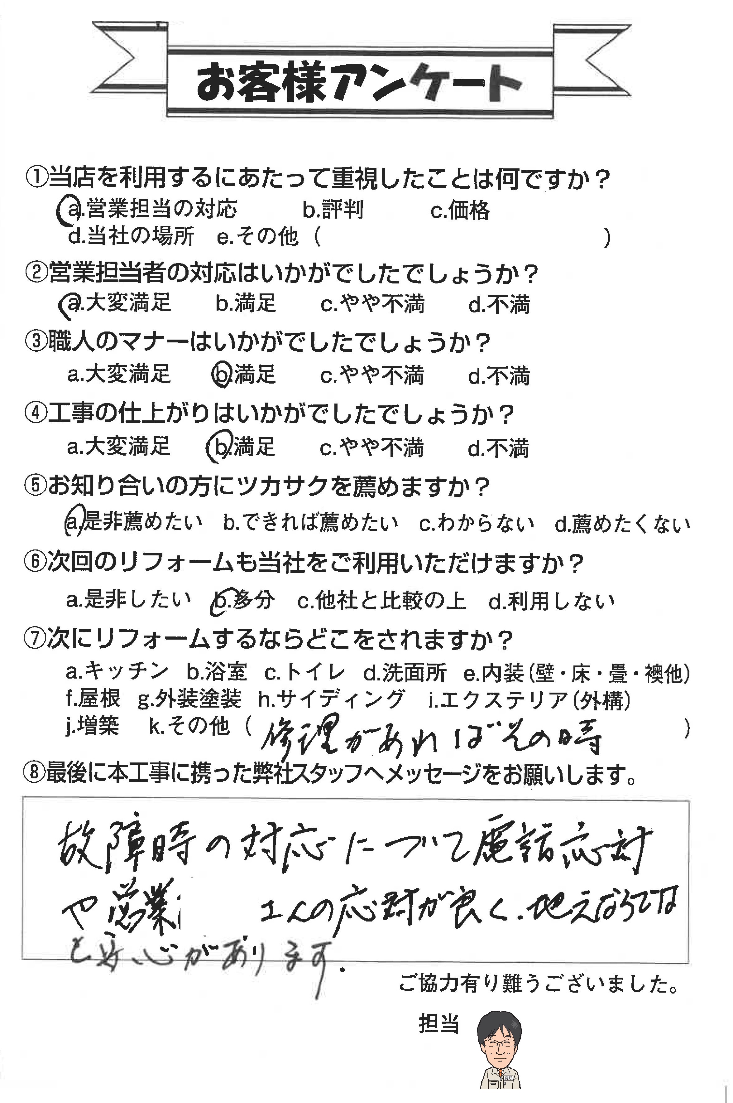 故障時の対応について電話対応や営業担当さんの対応が良く、地元ならではと安心があります。