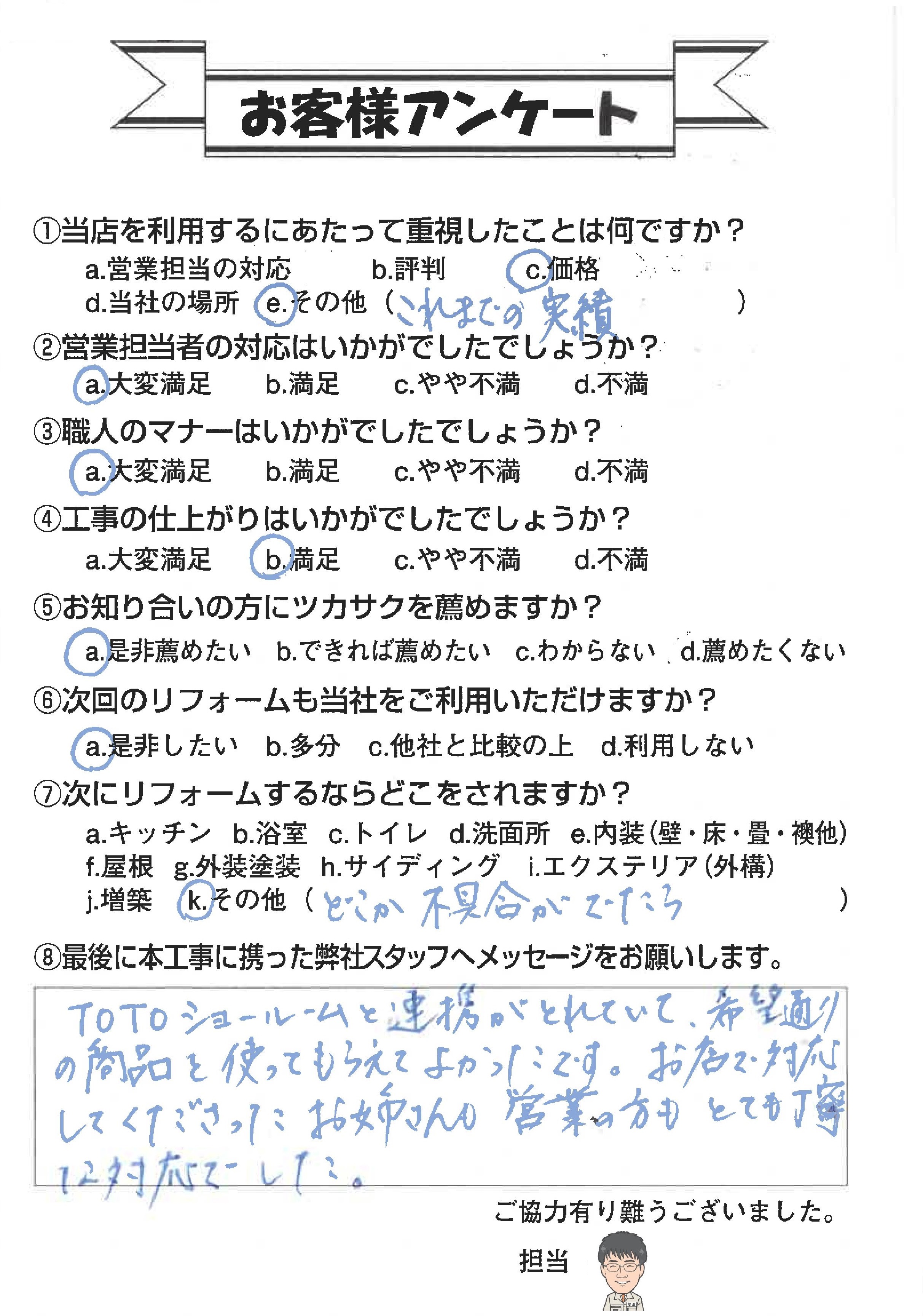 ご依頼いただきありがとうございました。 社員の対応についてお褒めいただきありがとうございます。 ツカサクでは各メーカーショールームと連携をとっております。安心してご依頼ください。